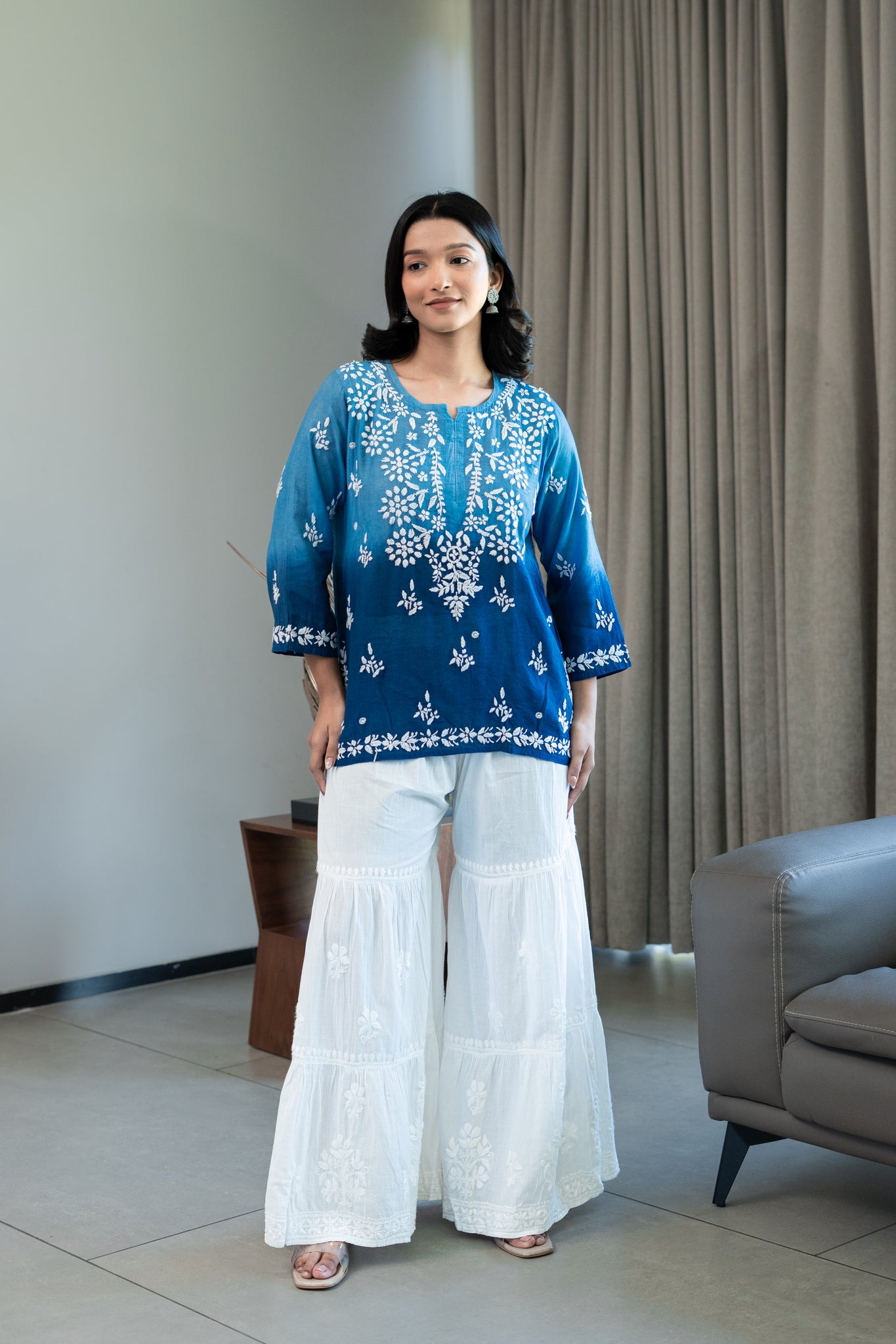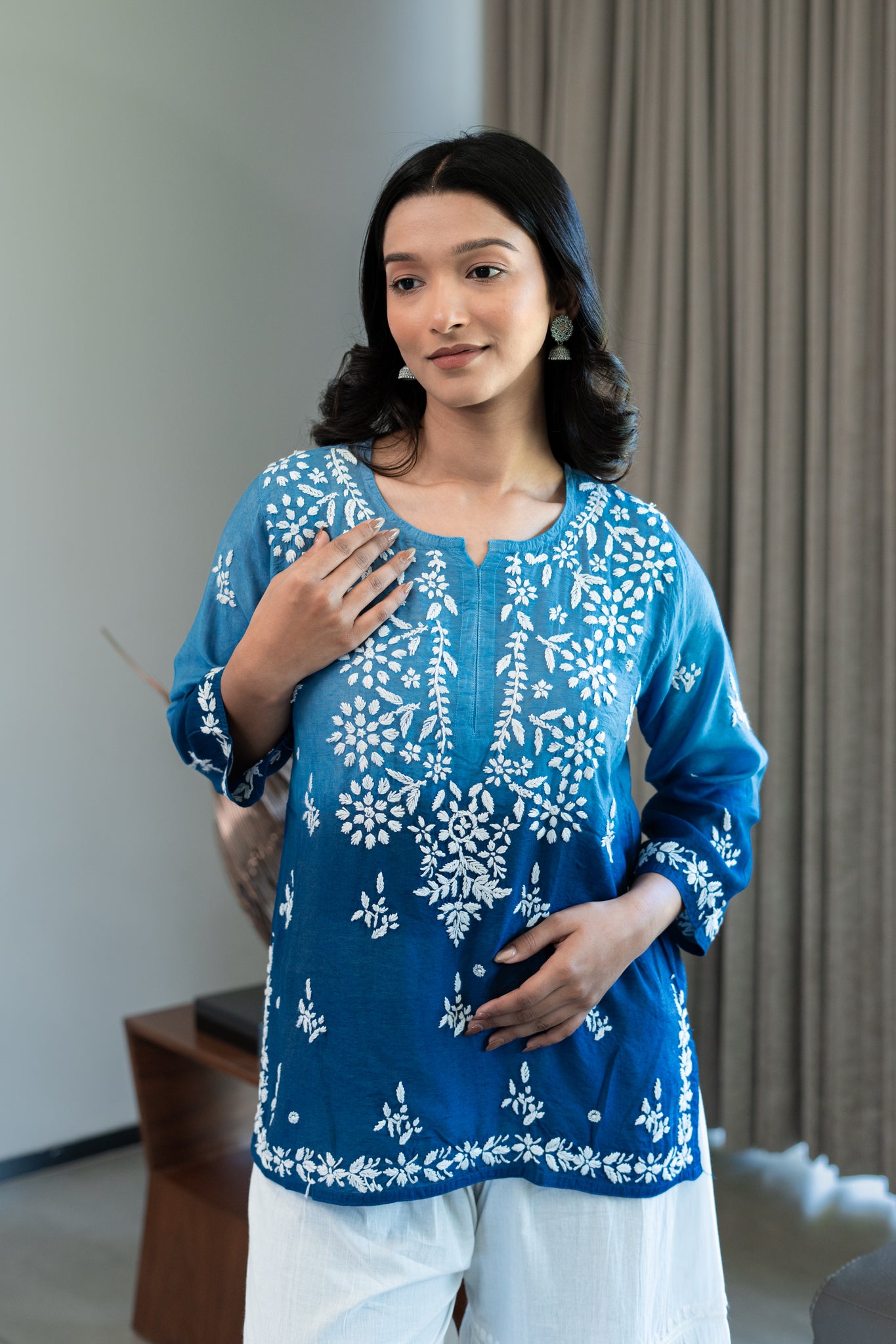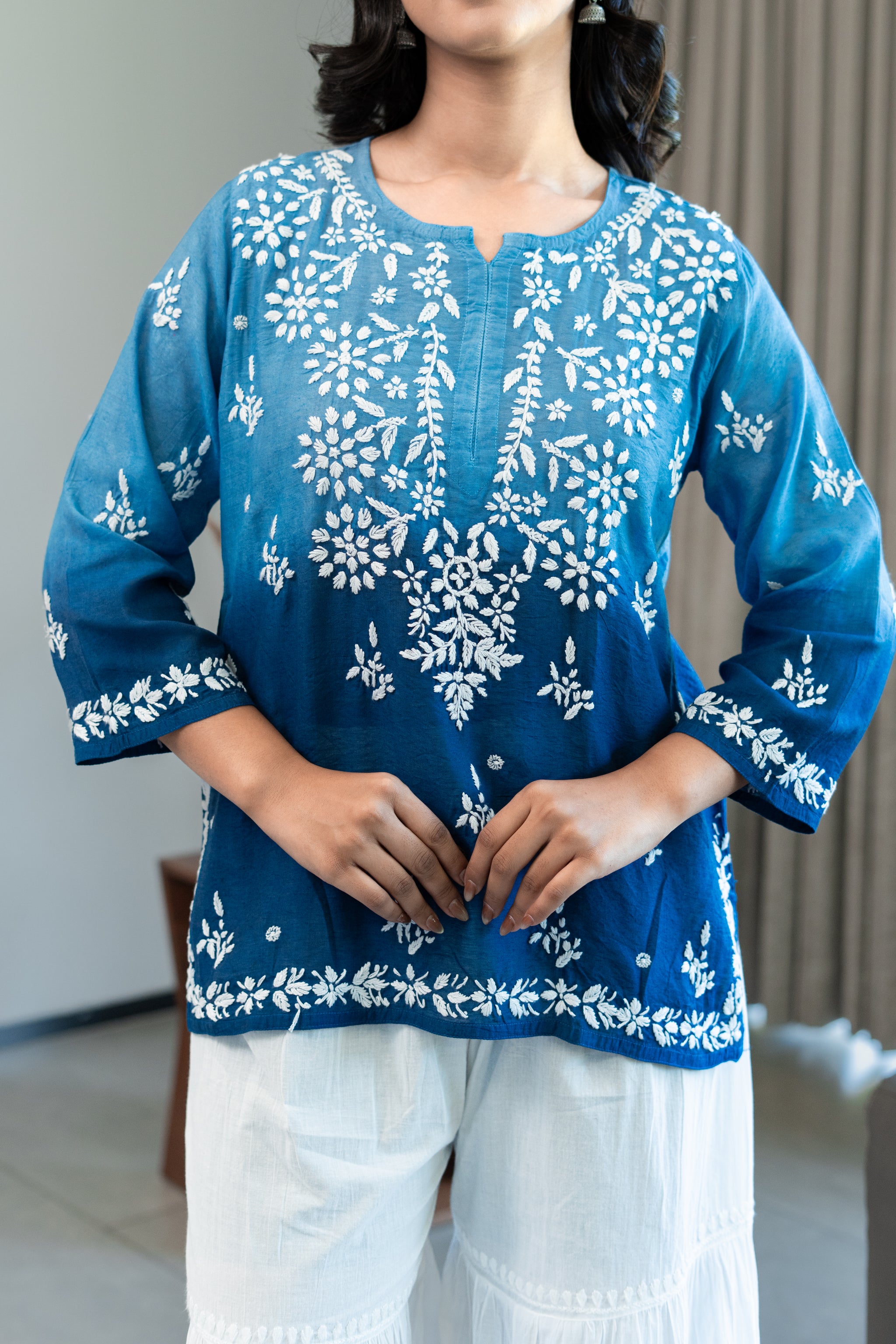 • Chanderi short chikankari kurti in double shading